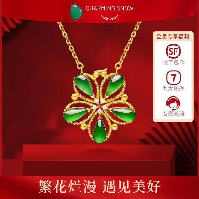 CHARMING SNOW翡翠吊坠高货有证书 24k足金镶天然A货翡翠项链999黄金挂件锁骨链